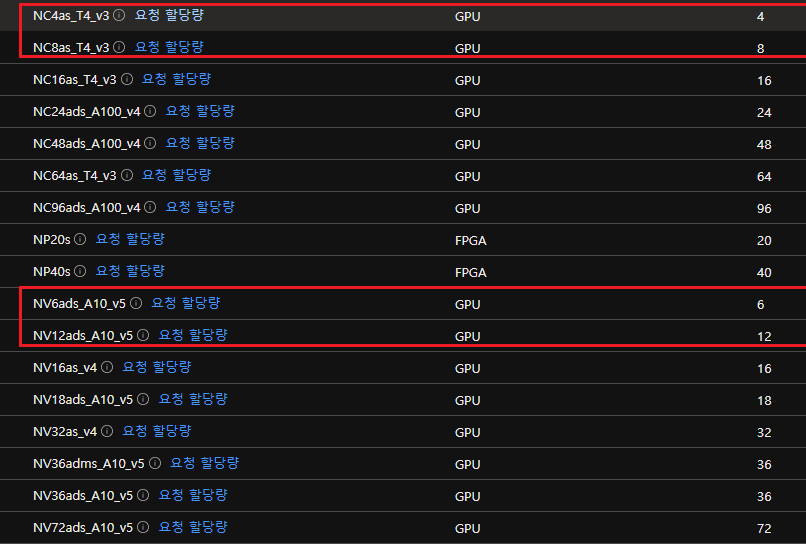 즉 Azure에서 해당 지역 가용성 영역에서 더 이상 사용 가능한 vCPU가 없기 때문에 할당량을 늘려달라고 마소 정부에 요청하는건데 딥러닝 학습을 목표로 한다면 할당량 요청할때 적어도 GPU 메모리 8G 이상 짜리로 신청하는게 좋다.