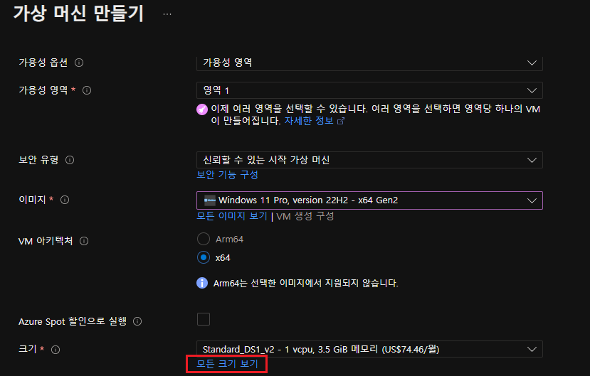 지역과 가용성 영역을 모두 확인했으면 그 담으로는 조금 내려 보면 아래 이미지처럼 크기란이 보이는데 여기서 모든 크기 보기를 클릭해주자