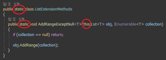아래의 코드는 List 클래스를 확장한 AddRangeExceptNull 메서드 이다.