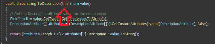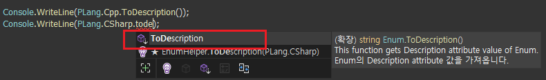 아주 간단하다 위에서 만들어준 ToDescription 메소드의 Enum 파라메터에 this 키워드만 붙여주면 된다.