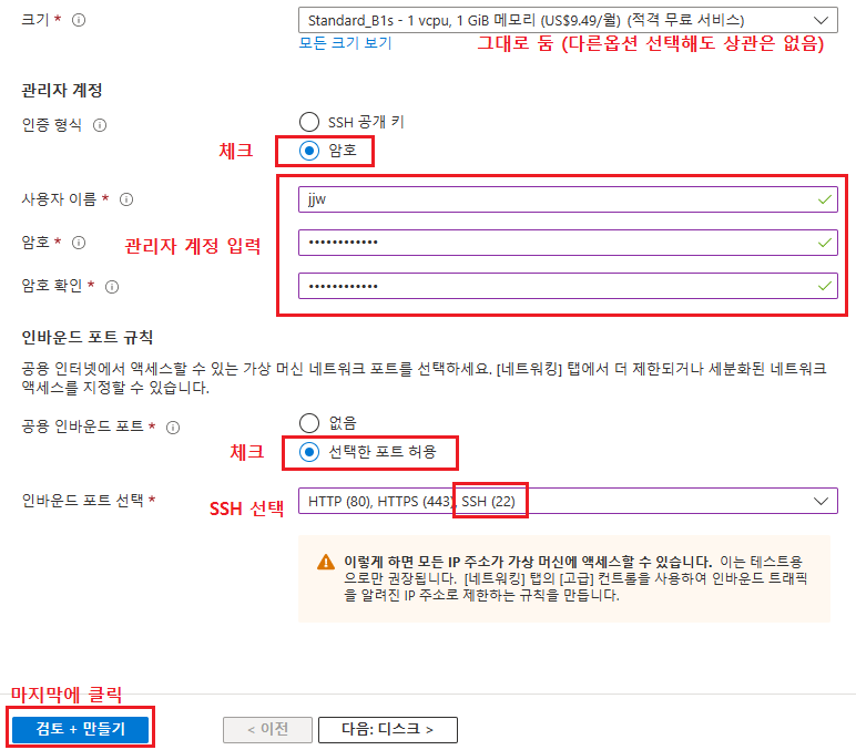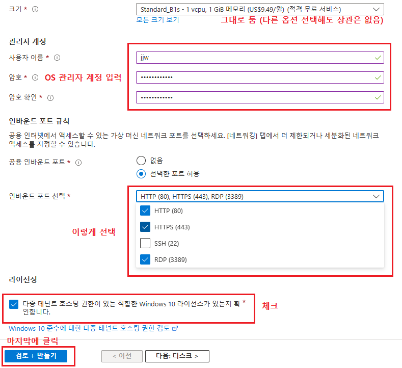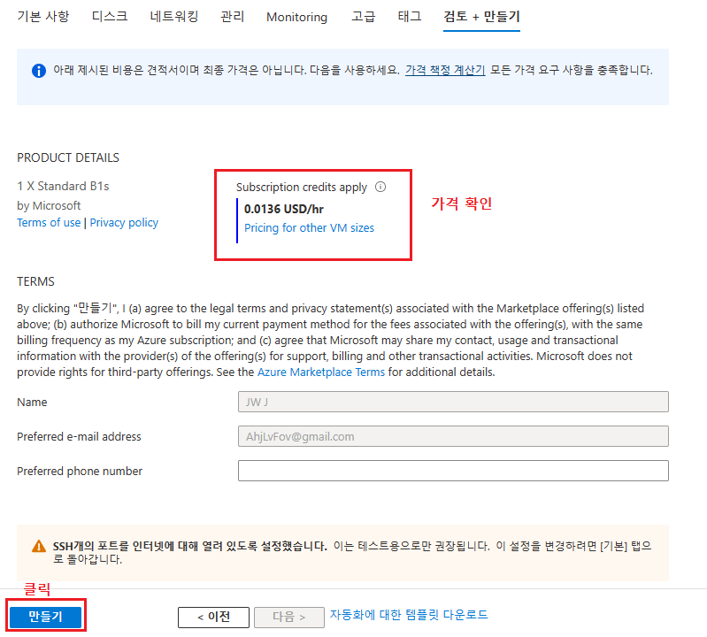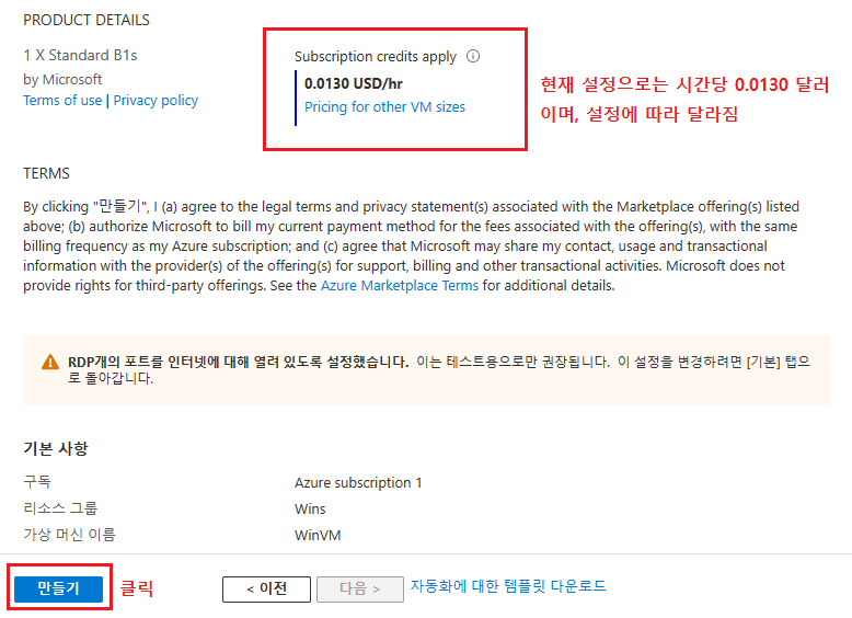 검토 + 만들기 버튼을 클릭하게 되면 아래의 화면으로 이동하는데 시간당 가격을 확인하고 만들기를 클릭한다.