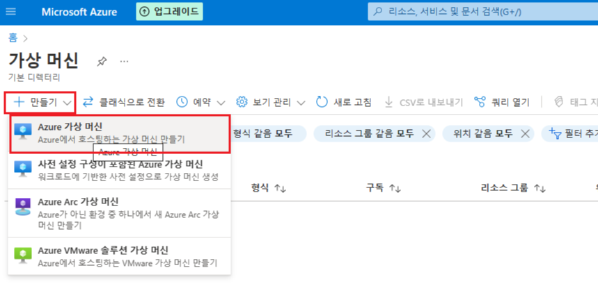 그러면 아래와 같은 화면이 나올텐데 만들기 클릭 후 Azure 가상 머신을 클릭하자.