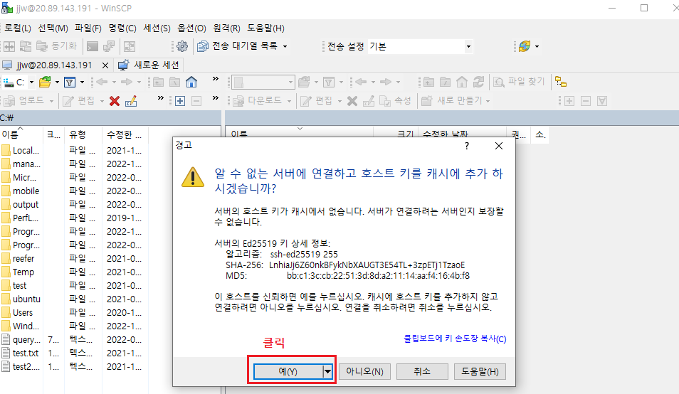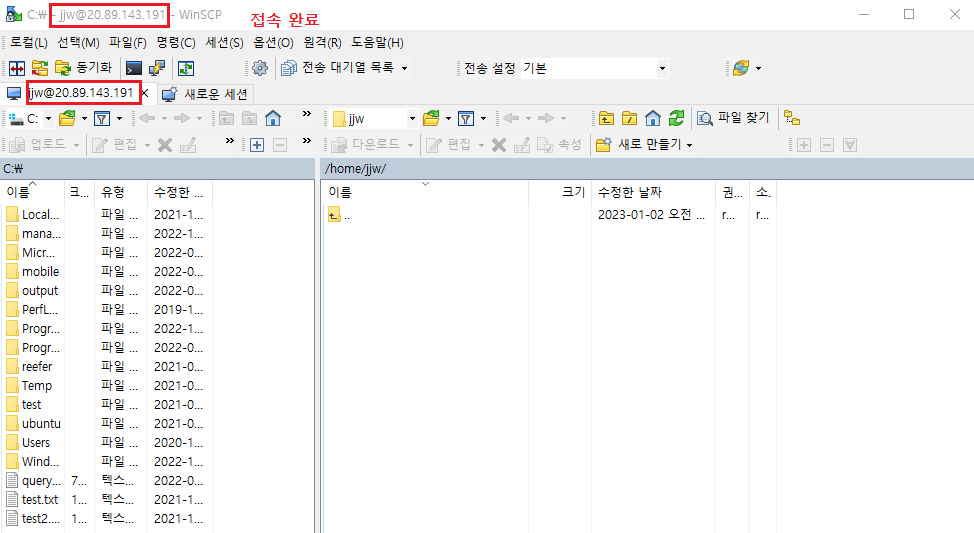 WinSCP나 putty 같은 프로그램으로 위의 공용 IP 주소와 가상머신 생성시 설정했던 관리자 계정 주소로 로그인한다.