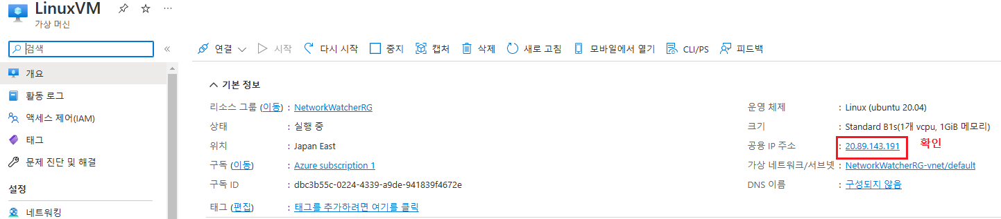 리소스 화면에서 공용 IP 주소를 확인하자.