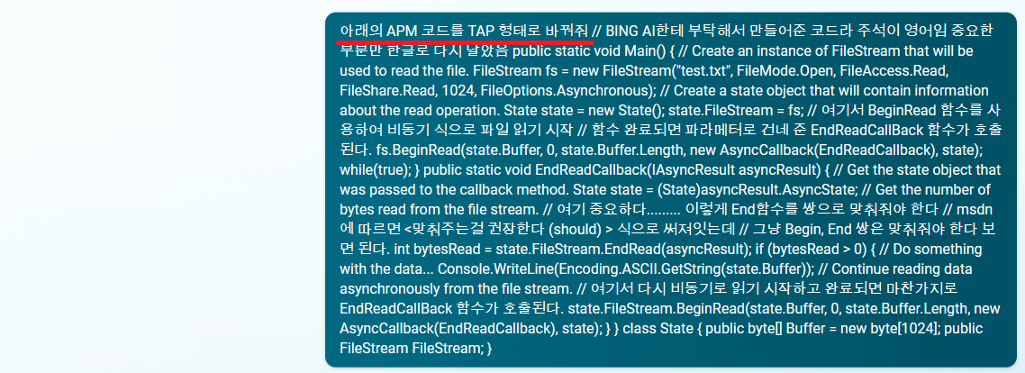 요즘 시대가 얼마나 좋은 시대인가 아래와 같이 BING AI 님에게 APM 코드 던져주면서 TAP 코드로 바꿔달라고 하면 바꿔주니 AI 님에게 문의하여 TAP 코드로 마이그레이션 하는 방법을 추천한다.
