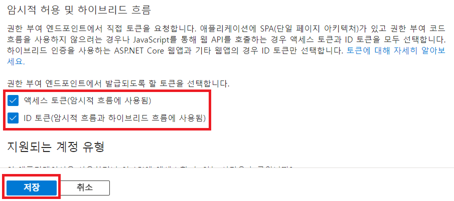 조금 내려보면 아래 이미지와 같이 암시적 허용 및 하이브리드 흐름 란이 있는데 여기서 액세스 토큰이랑 ID 토큰 둘 다 체크 해주고 저장하자.
