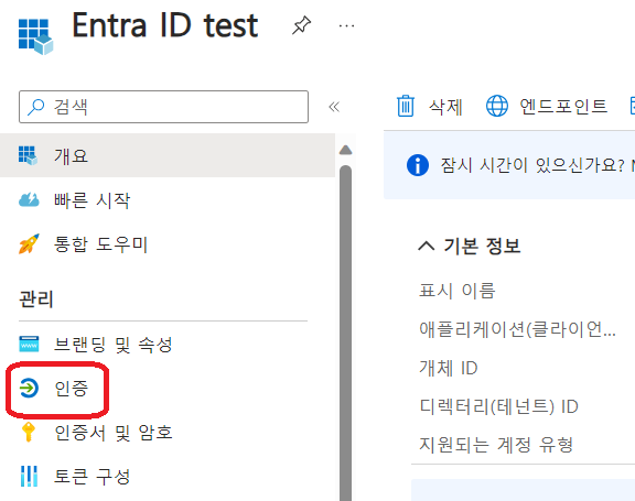 그러면 애플리케이션이 등록 된 후 개요 화면이 나오는데 아래처럼 인증을 클릭하자.